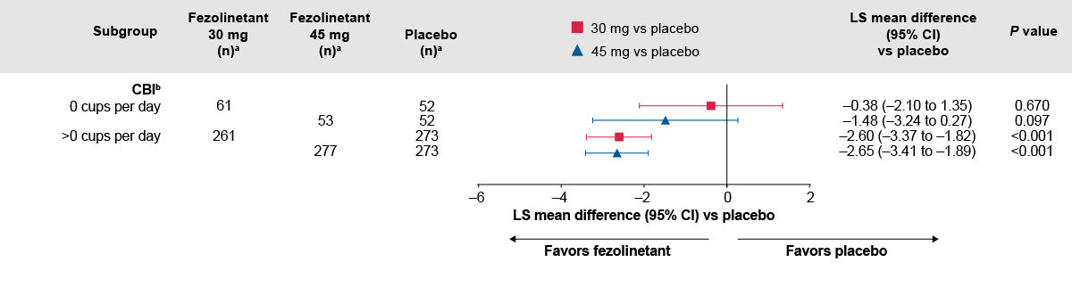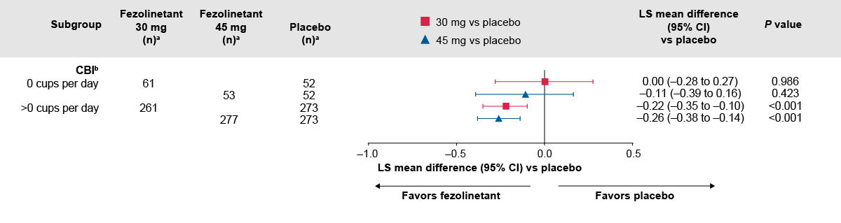 Figure 2. Difference in change from baseline to Week 12 in VMS severity between fezolinetant groups and placebo by caffeine use at baseline.2