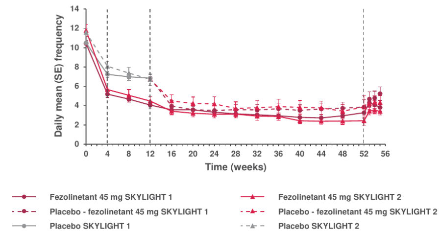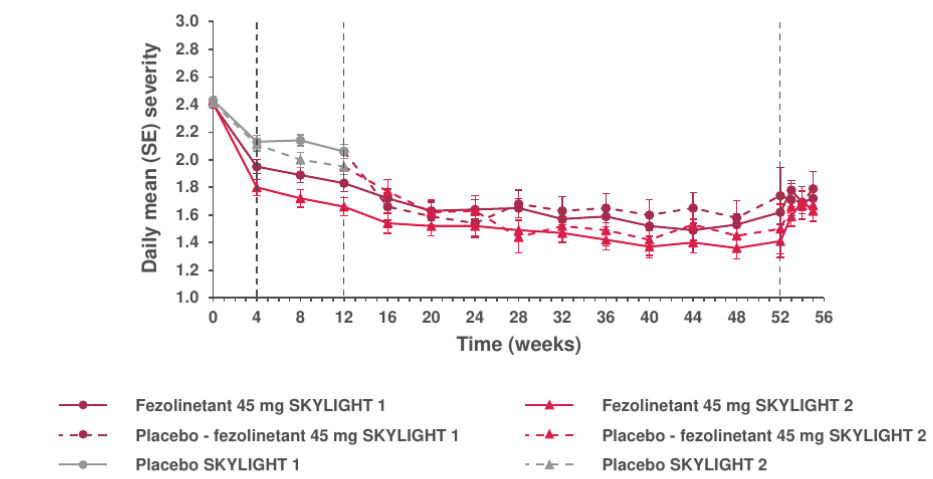• In SKYLIGHT 1 and 2, follow-up occurred approximately three weeks following the last dose of study drug (Week 55).7 Participants continued to record VMS frequency and severity through the follow-up visit (Figures 1 and 2).