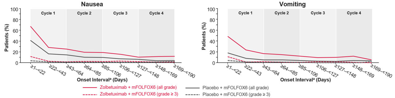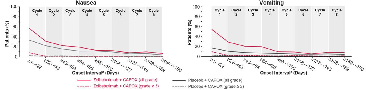 In SPOTLIGHT and GLOW, the incidence of nausea/vomiting was most frequent in Cycle 1 with zolbetuximab + mFOLFOX6/CAPOX and decreased in later cycles