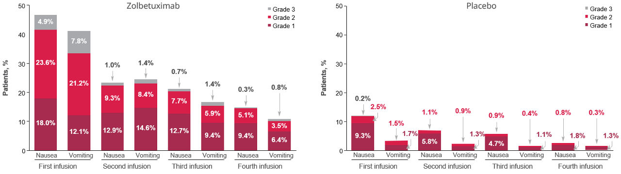 In the combined SPOTLIGHT and GLOW analysis, nausea and/or vomiting were most common on the first infusion day of zolbetuximab and generally decreased on infusion Days 2 to 4.1