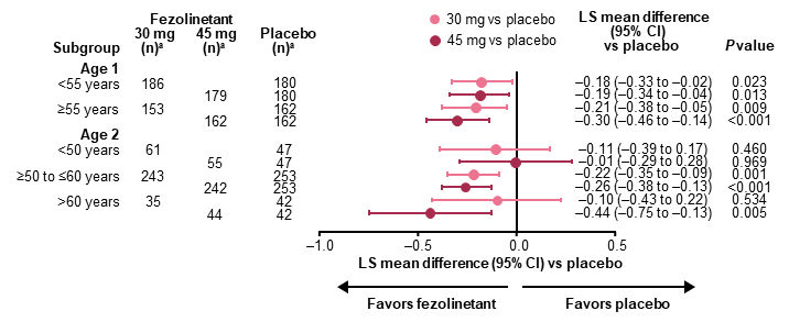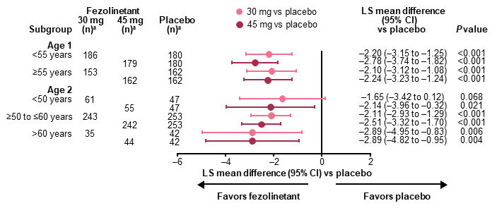 Figure 2. Change in VMS severity from baseline to Week 12 by baseline age in the full analysis set (all randomized participants assessed according to the randomization at first dose).1