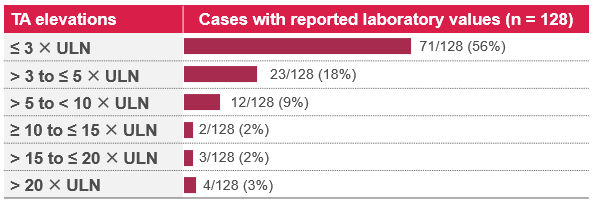 • In 5% (6/128) of reported cases, patients had concurrent increases in transaminases (> 3 x ULN) and bilirubin (> 2 x ULN).1